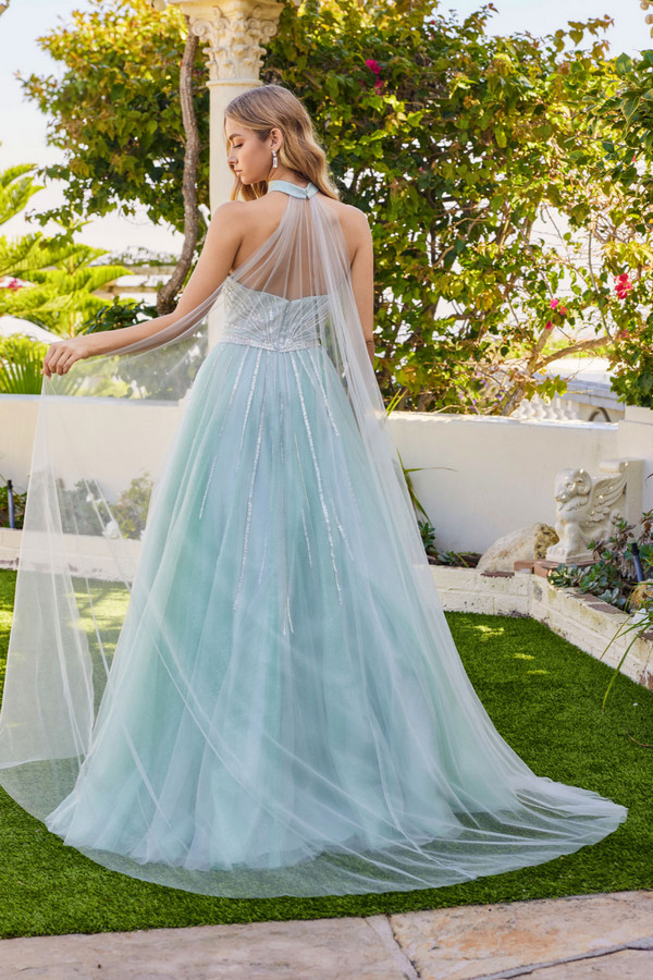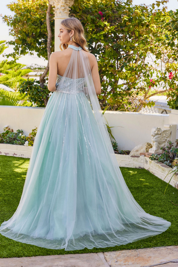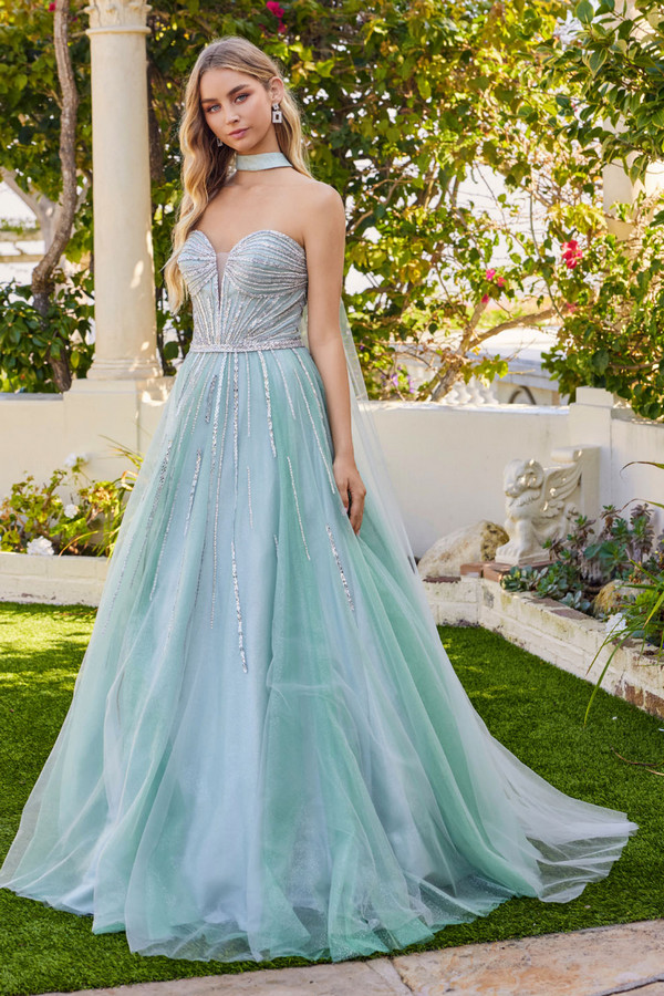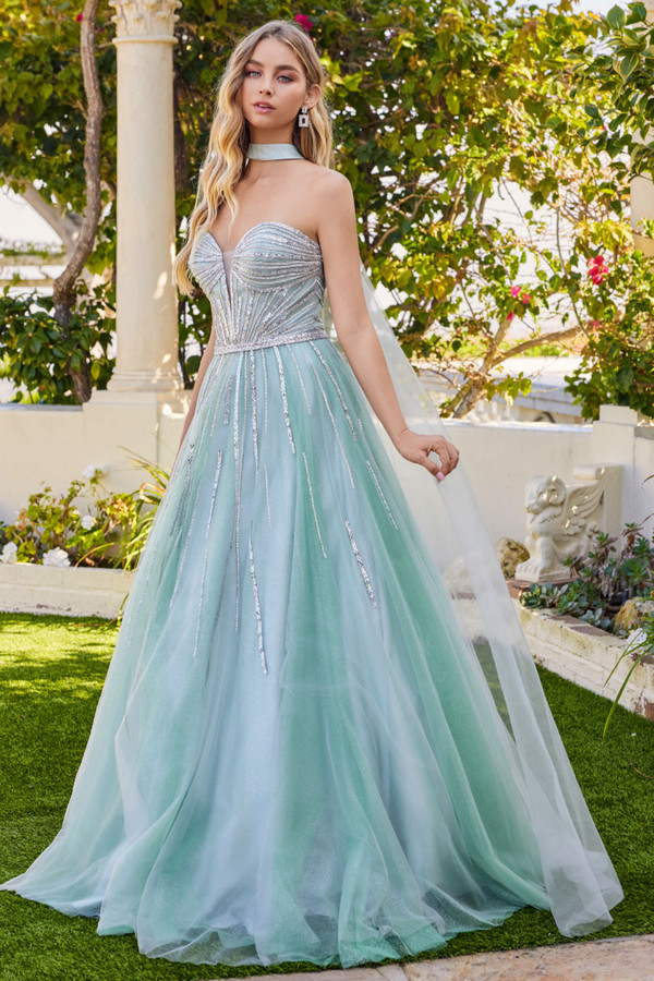 Strapless ball gown with a structured bodice featuring directional beadwork that shapes the neckline and waist. A sheer detachable scarf drapes from the neck and flows toward the back for added movement. Full skirt is layered with tulle and finished with elongated beaded accents that extend from the bodice. Back closure is secured with a hidden zipper for a smooth fit.