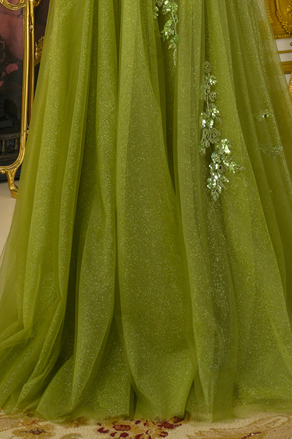 Romantically radiant, this A-line floor-length gown is designed to captivate. Supported by spaghetti straps, the sheer V-neck bodice seamlessly transitions into a flowing skirt. Intricately embellished with 3D floral appliqués, embroidery, sequins, and beads, every detail catches the eye. A glitter mesh underlayer adds subtle shimmer and dimension.