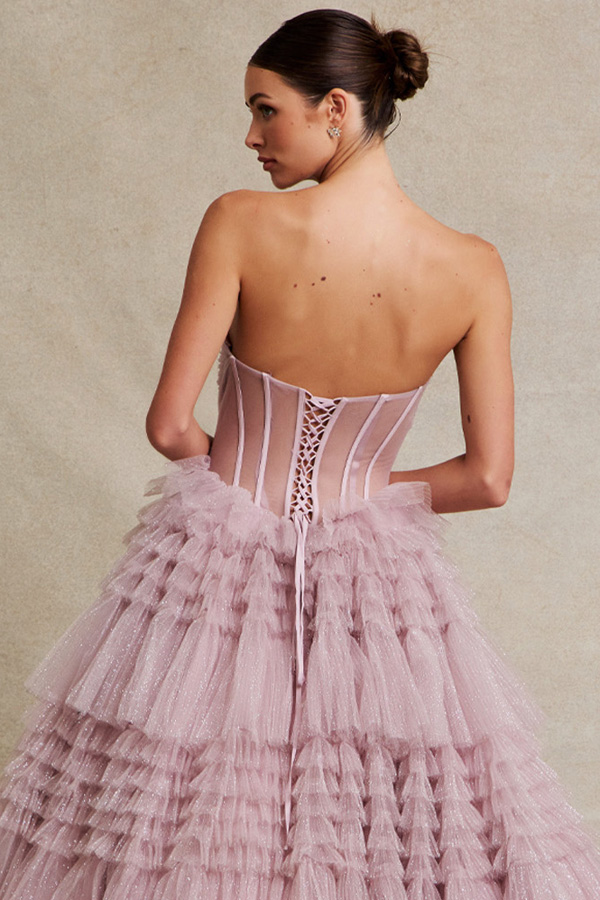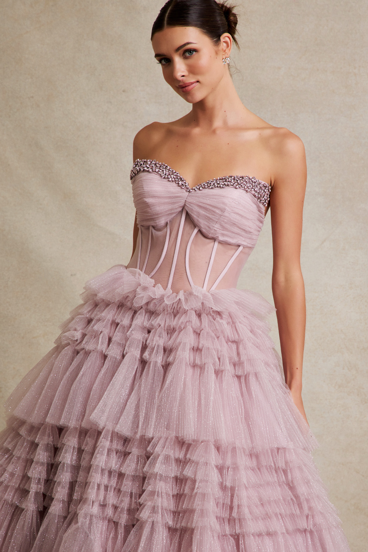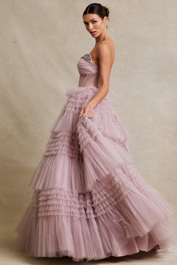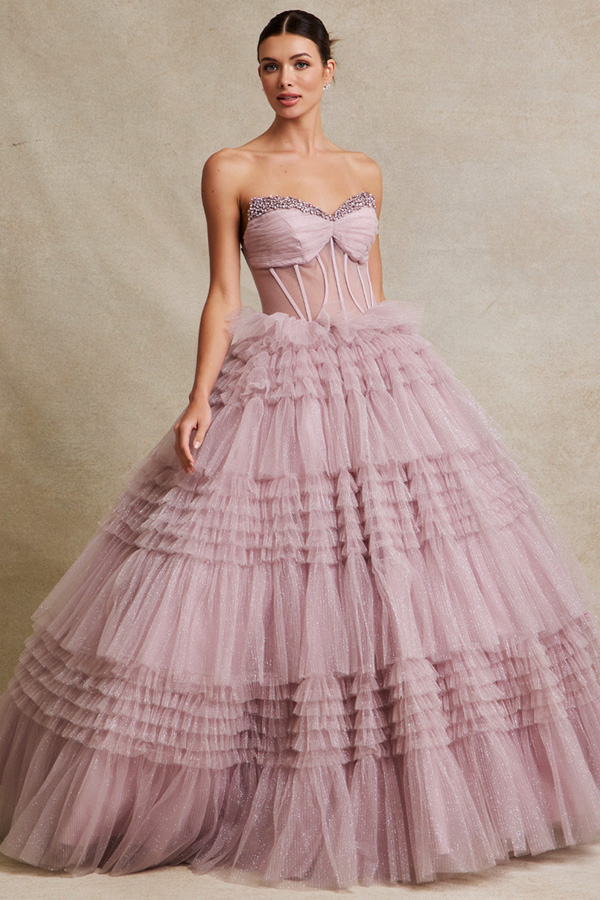 Color: MAUVEStrapless Sweetheart A Line Ball Gown w/ Bead Trim Neckline, Ruffle Skirt.