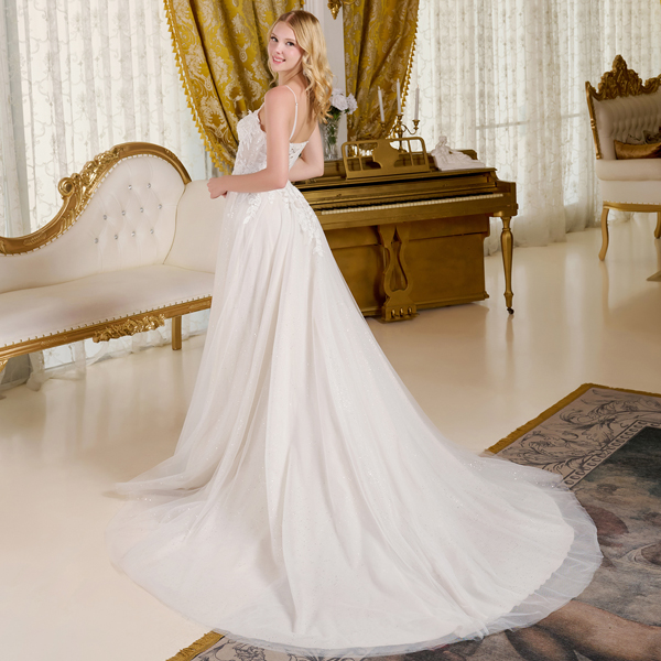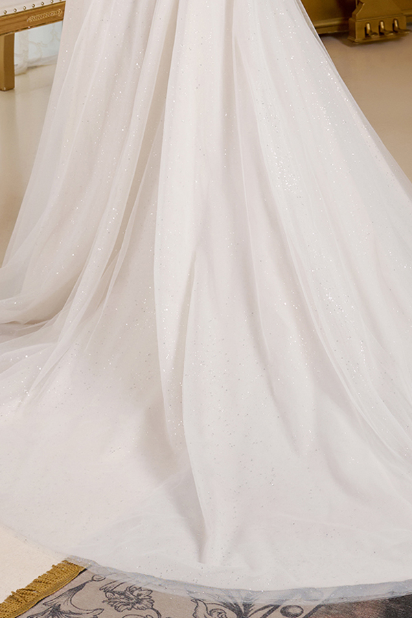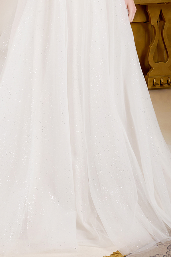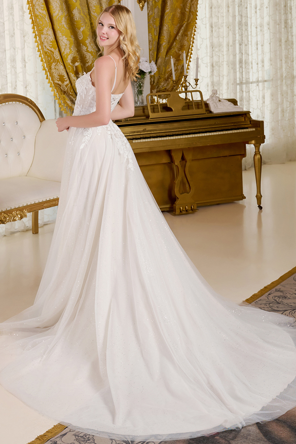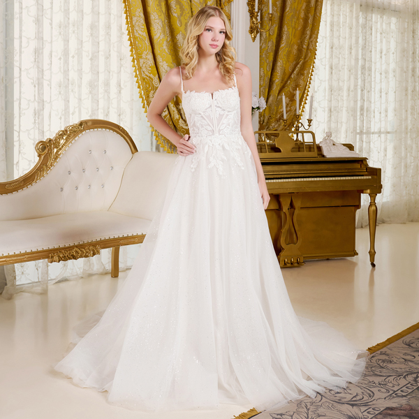A-line wedding dress is supported by delicate spaghetti straps. The bodice, designed with a boat neckline, is richly adorned with beads, embroidery, sequins, and a hint of glitter for a luminous touch. The skirt maintains a clean and refined silhouette, subtly illuminated by a glittery underlayer that shines through from top to hem. Flowing gracefully, the skirt opens into a train.