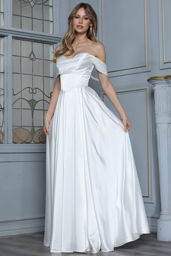 Color: OFF WHITE Size:- Off Shoulder Sweet/Cowl Neckline A Line Satin Dress