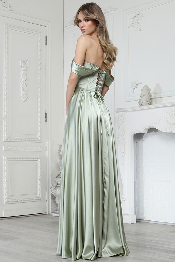 Color: SAGE Size:- Off Shoulder Sweet/Cowl Neckline A Line Satin Dress