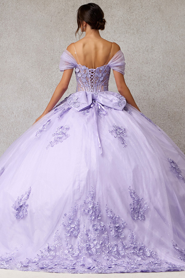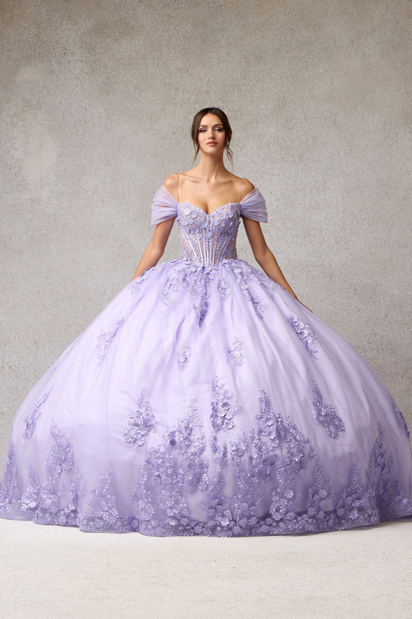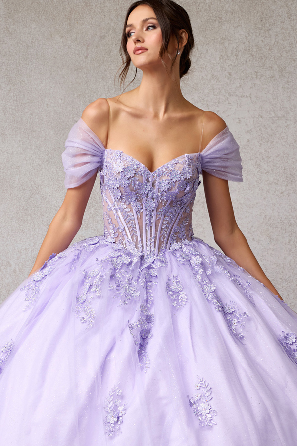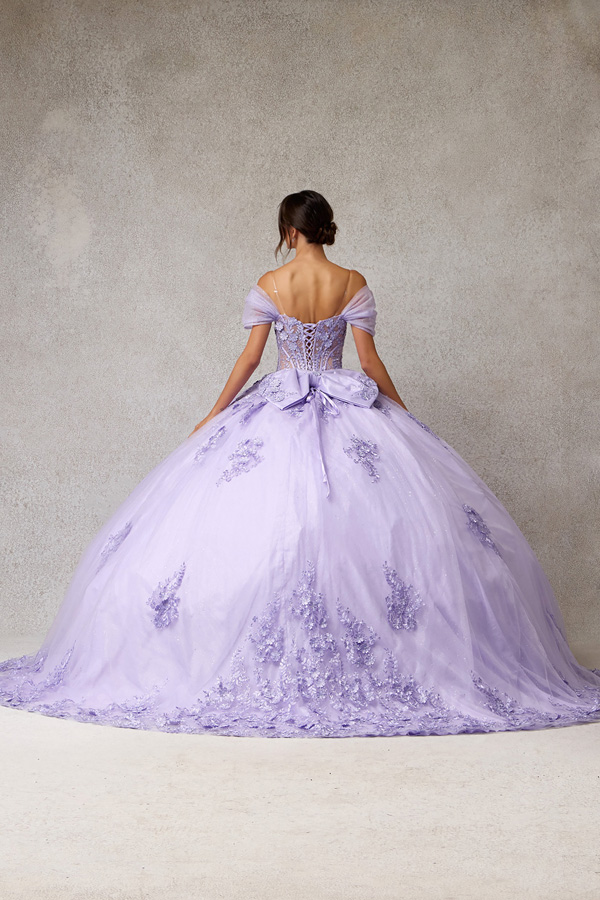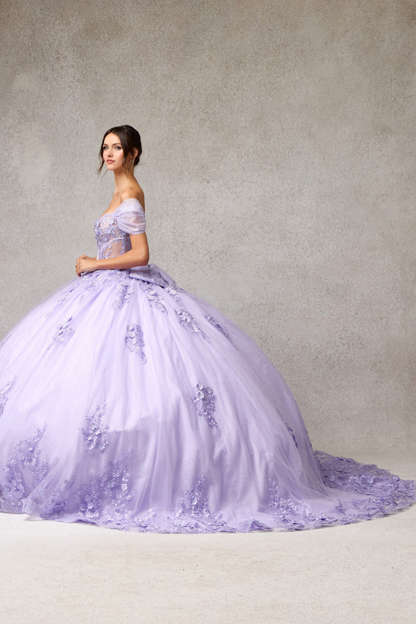 Quinceanera Ballgown w/ Gathered Off Shoulder Sleeve.
