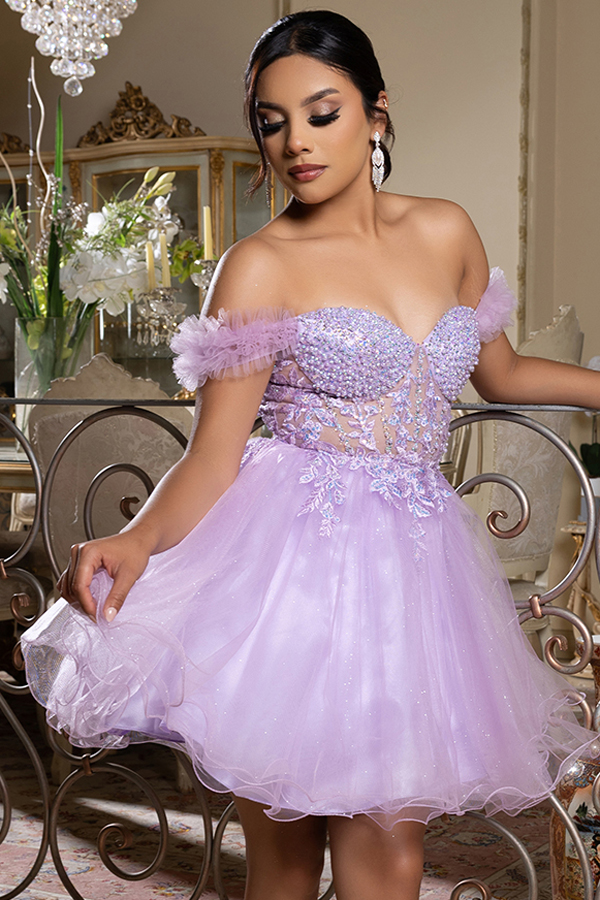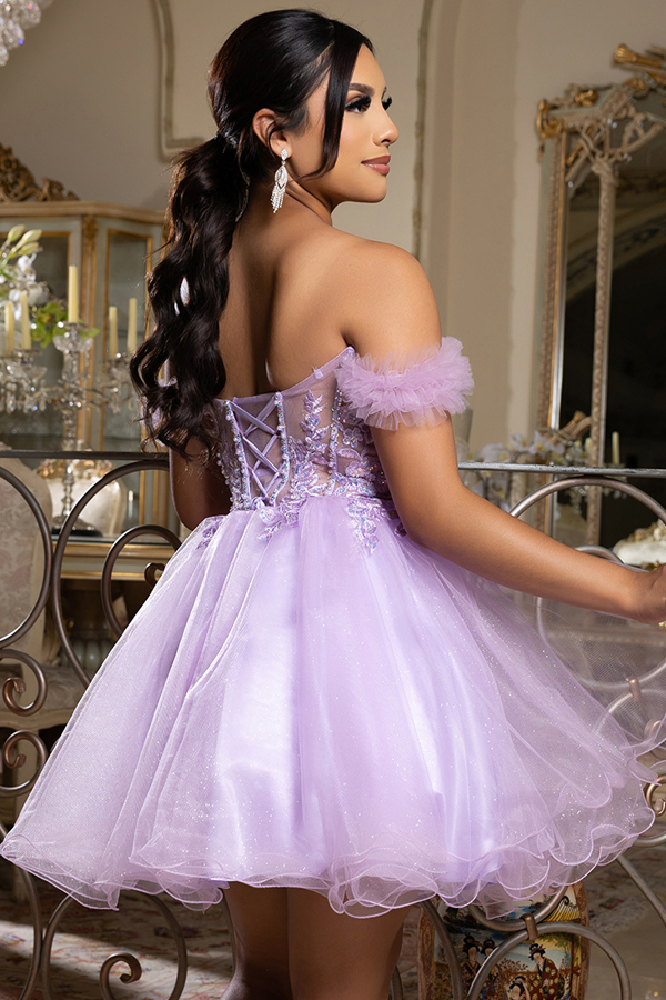 Color: LILAC Size:- Off Shoulder Ruffle Sleeve Sweet Top Short Dress
