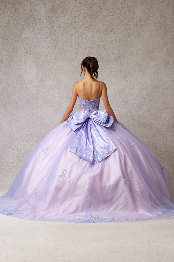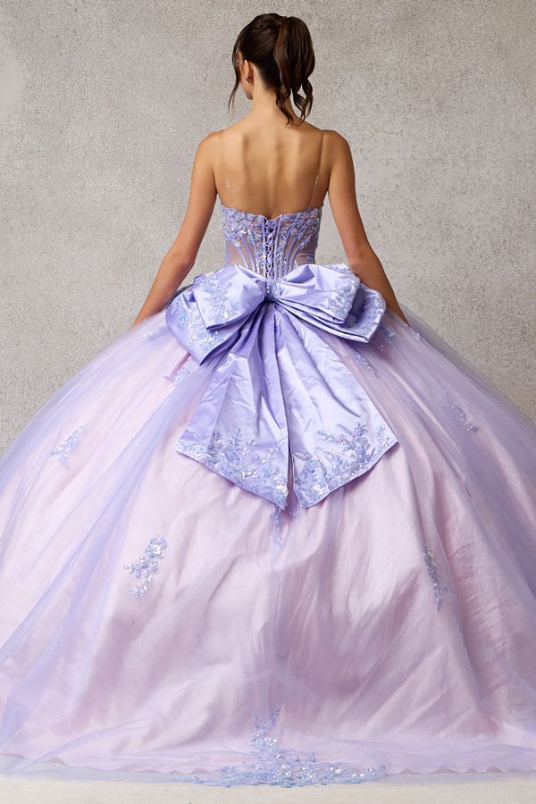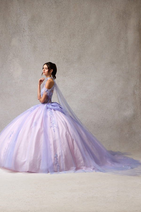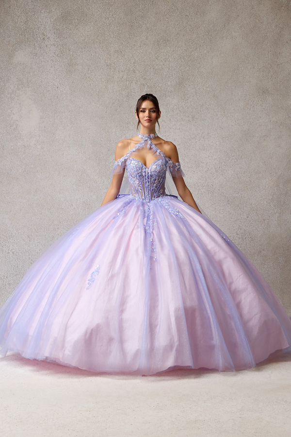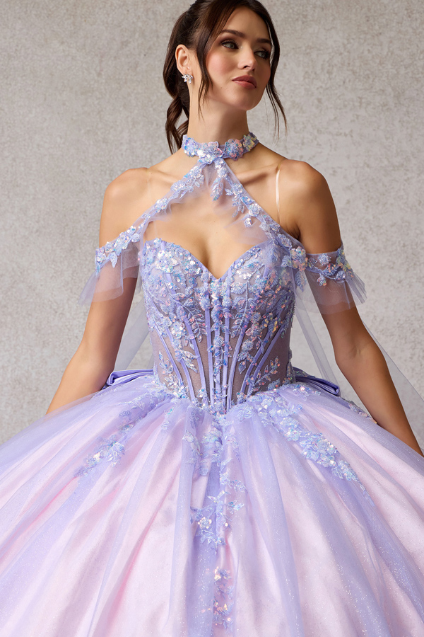 Off Shoulder Choker Mesh Cape Train, Embellished Sweetheart Top Quinceanera Dress with Detachable Bow Back.