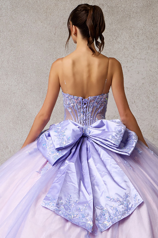 Features: Lace-Up Fit, Illusion Top, Clear Straps, Embroidery/Glitter Lace/Bead/Sequin Embellishment, Chapel Length.