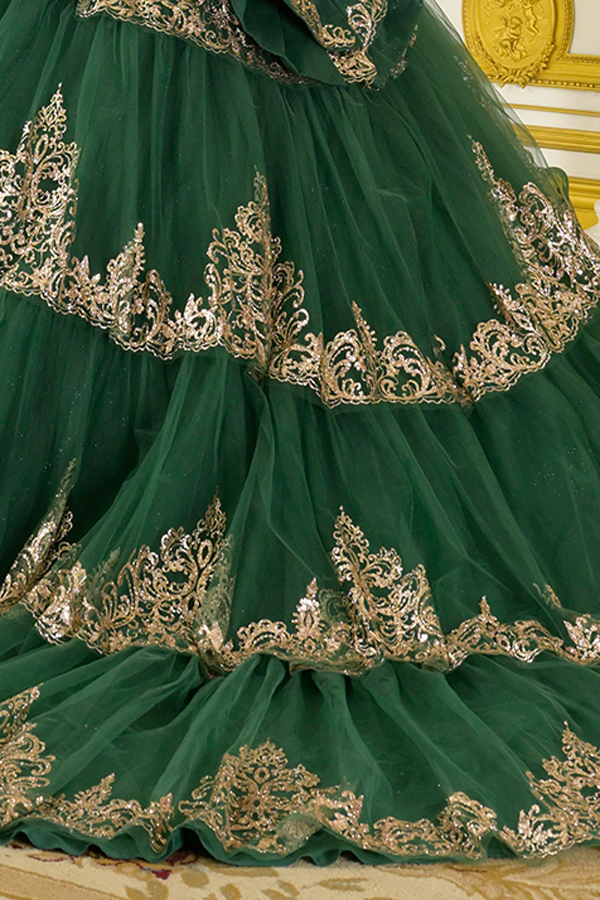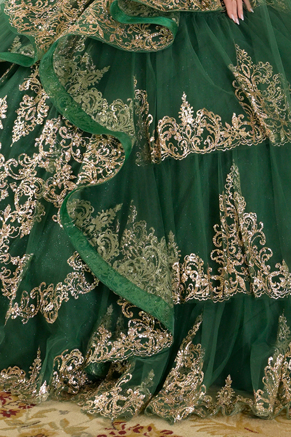 Qunceanera ball gown with embellished straps accented with small detachable bows and flowing mesh tails that create a graceful, train-like effect. The gown sparkles with intricate patterns of jewels, sequins, and glitter, complemented by a glitter tulle underlayer. The V-neckline corset bodice flows into a Basque waistline. The voluminous skirt of tiered, cascading ruffles extends into a sweeping train, finished with a detachable back bow.