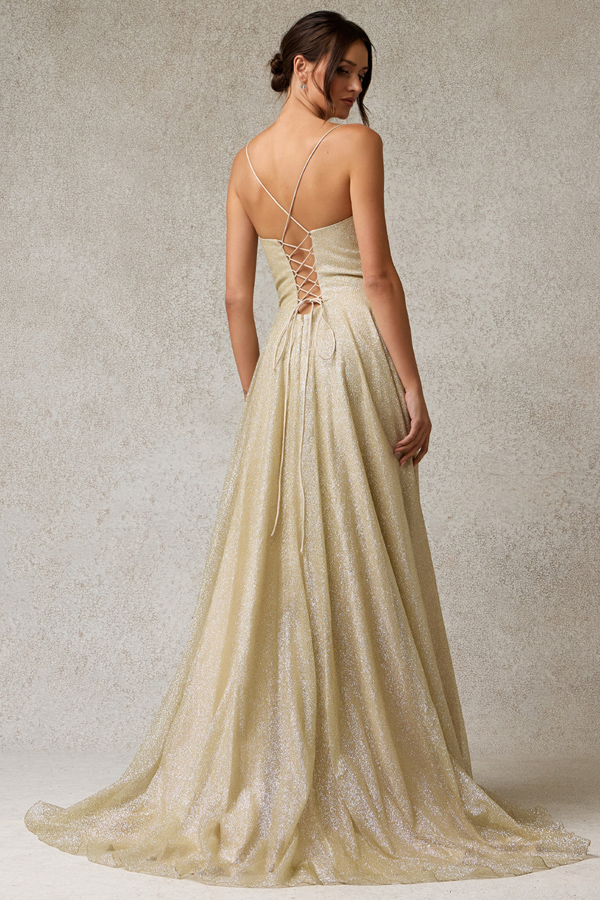 Spaghetti Straps Metallic A Line Dress with Cowl/Sweetheart Neckline.