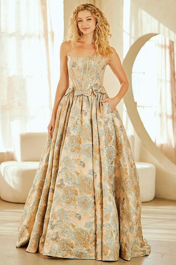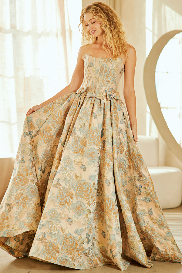 Features: Bone-In Corset Top, Pleat Skirt, Floor Length. Floral/Butterfly Pattern
