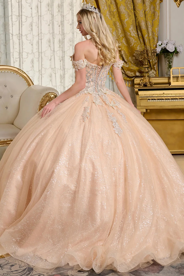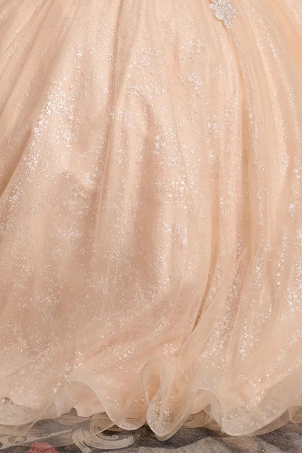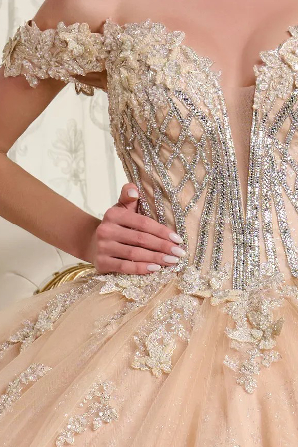 Bejeweled corset bodice with a Plunging V-neckline and off-the-shoulder straps, richly embellished with 3D flora/butterflyl appliques, beads, jewels, sequins, and glitter. The intricate detailing extends across the top of the bodice and gracefully accents the waistline. The skirt has a glitter netting underlayer, with subtle, scattered embellishments near the waist.