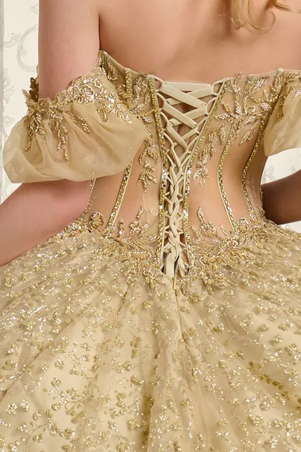 Sheer, bejeweled corset bodice paired with off-the-shoulder bubble hem sleeves. The upper bodice is intricately adorned with beads, embroidery, jewels, and sequins, which elegantly extend to accent the tops of the sleeves. The skirt, designed with a classic Basque waistline, features plant-inspired motifs created with puff ink detailing, adding texture and visual interest throughout the gown.