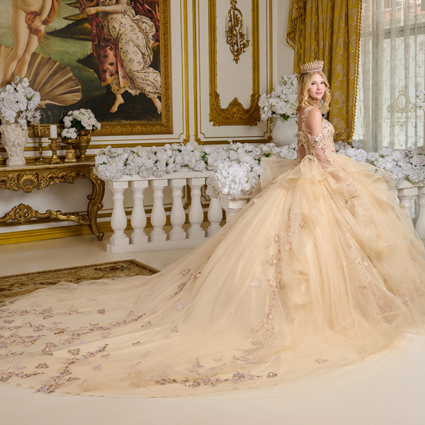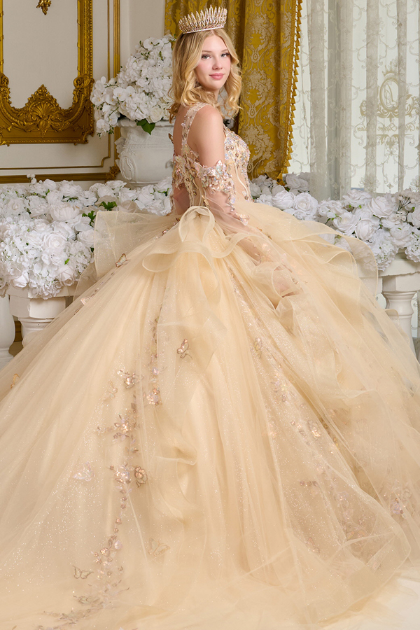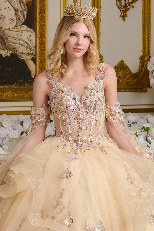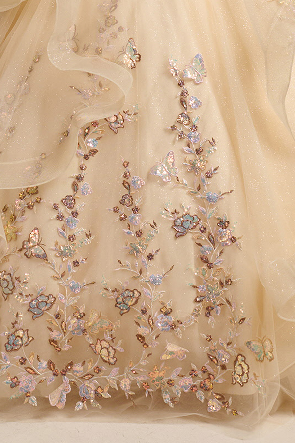 Sheer shoulder straps adorned with intricate 3D butterfly appliques, beads, embroidery, jewels, sequins, and shimmering glitter. Cape sleeves add an ethereal touch. The sheer V-neckline bodice flows seamlessly into a cascading ruffle skirt that gently flares into a sweeping train. Beneath it all, a delicate glitter underlayer adds sparkle to every movement.