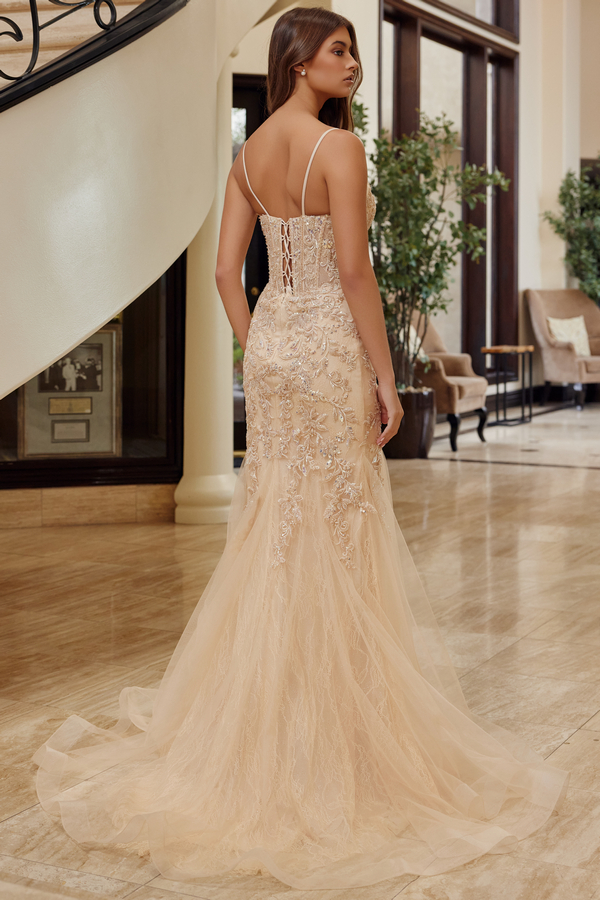 Color: CHAMPAGNE Size:- Plunging Neck Bead Sequin Embellished Trumpet Gown