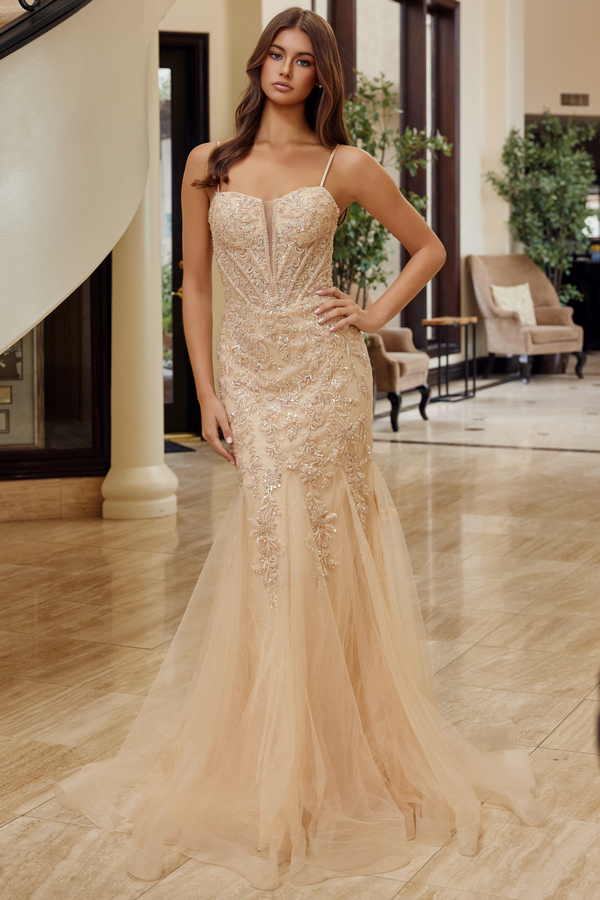 TRUMPET SILHOUETTE TULLE MATERIAL PLUNGING SEMI SWEETHEART BUSTLINE WITH SPAGHETTI STRAPS AND A LACE UP BACK.