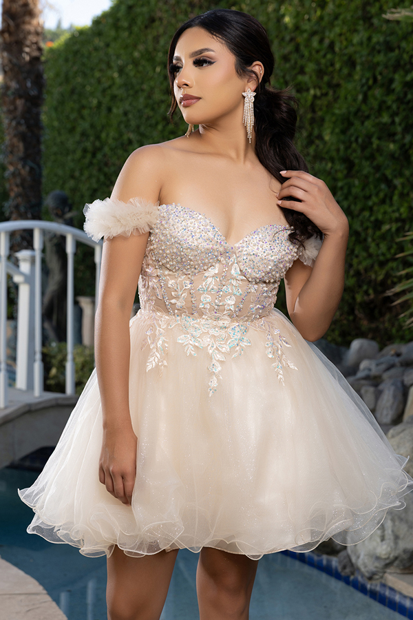 Features: Pear/Bead Embellished Illusion Top, Embroidery Design, Wired Skirt, Mini Length