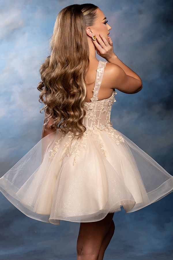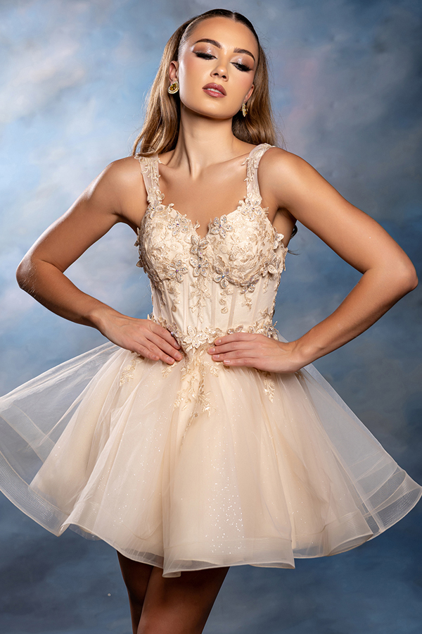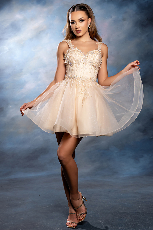 Color: CHAMPAGNE Size:- Short Dress w/ Embroidered Sweetheart Top
