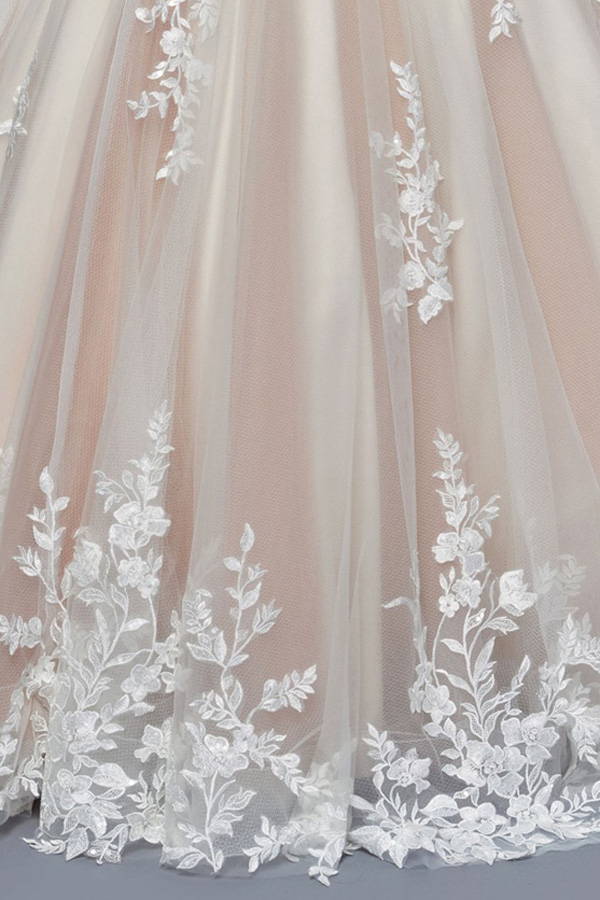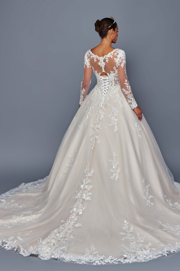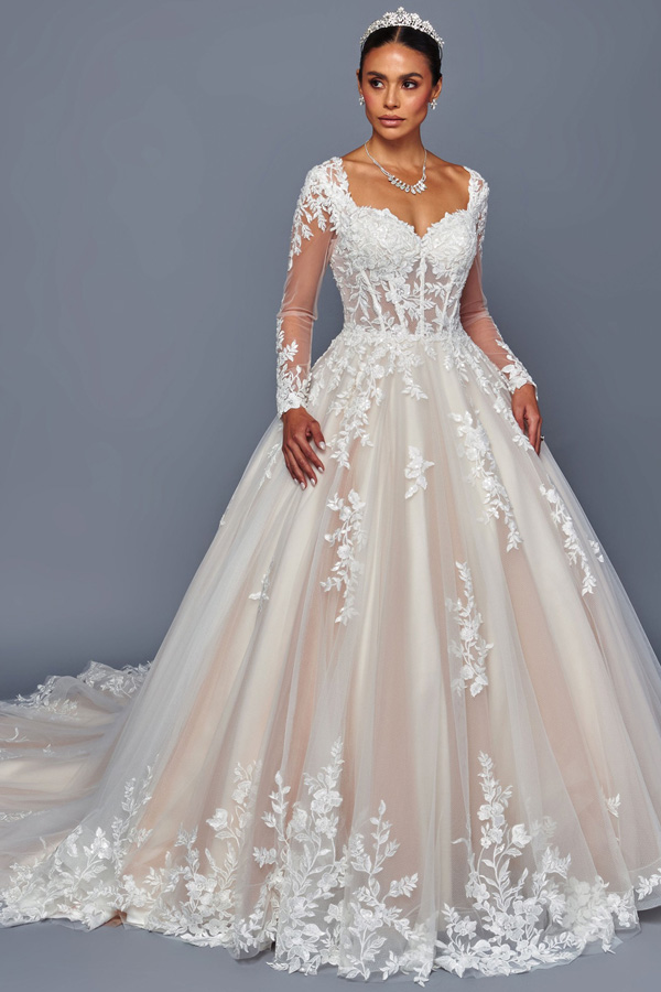 Color: CHAMPAGNE Size:- Sheer Long Sleeve Sweetheart A Line Chapel Bridal Gown