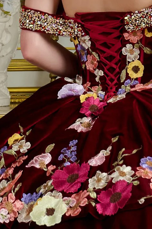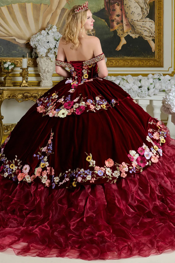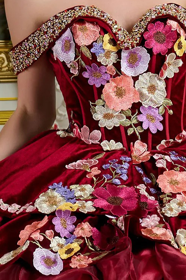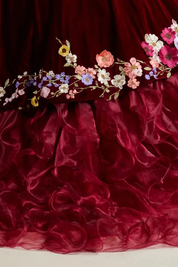 Framed by off-shoulder straps, richly adorned with beads, jewels, and sequins, that trace the edge of its V-neckline. From the waist, the velvet transitions into two cascading tiers that gracefully extend into the back. Beneath, layers of soft organza ruffles form the voluminous skirt. Vibrant floral embroidery decorates the velvet, adding bursts of color that beautifully contrast the gown's otherwise monochromatic palette.