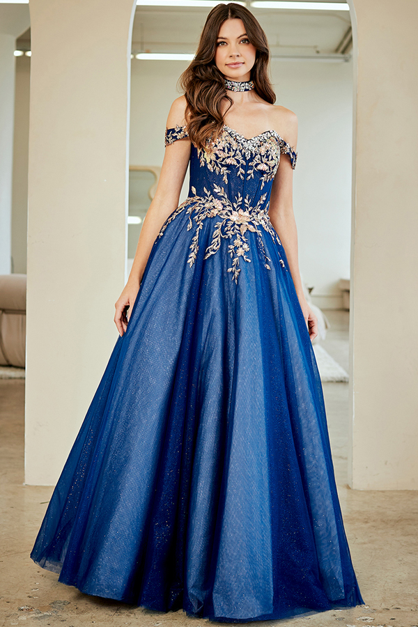 Off the Shoulder Sweeheart Golden Embroidery Jewel Neckline A Line Dress.