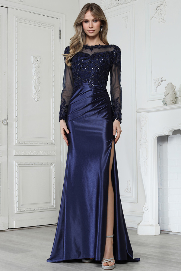 Laced Sheer Long Sleeve Illusion Boat Neckline Satin Evening Dress.