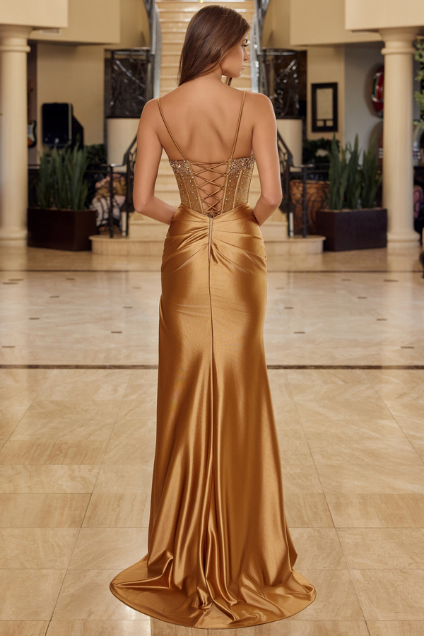 Color: GOLD Size:- Spaghetti Strap Embellished Peak Neck Satin Dress