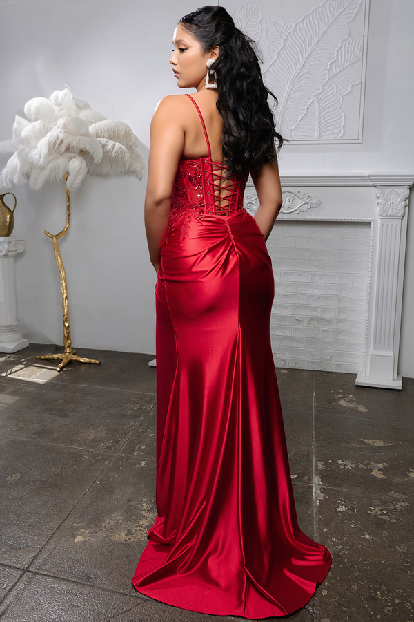 Color: RED Size:- Sleeveless Spaghetti Straps Embellished Satin Sheath Dress