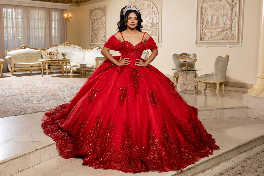 Off Shoulder Sweetheart Extra Wide Monarch Length Quinceanera Ball Gown.
