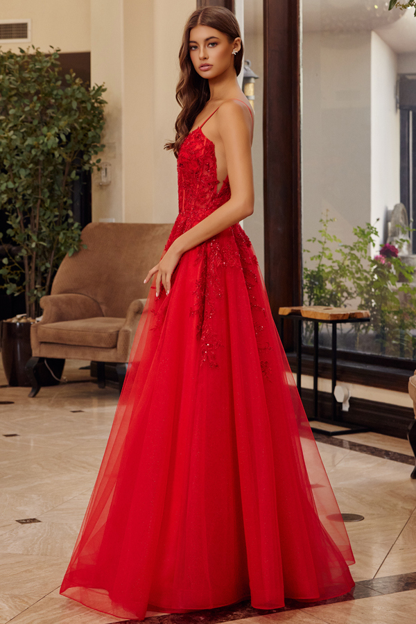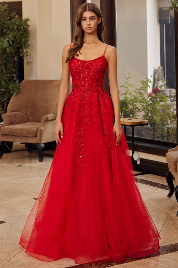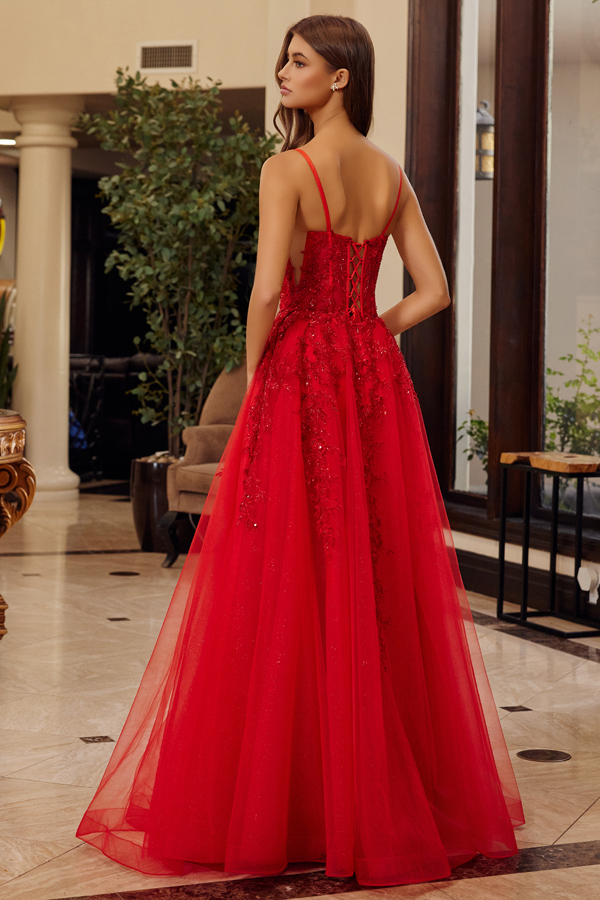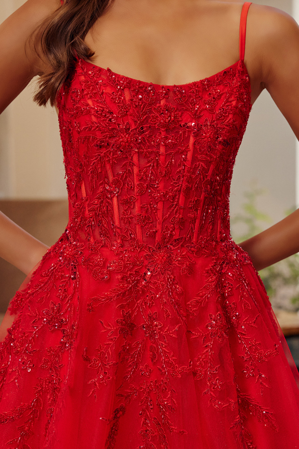 A LINE LONG GOWN SCOOP NECKLINE THIN STRAPS FULL EMBROIDERY BODICE WITH SHEER BONED WAISTLINE AND A HIGH SLIT WITH A COURT TRAIN ANDA LACE UP BACK.