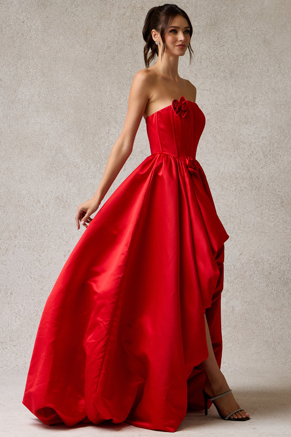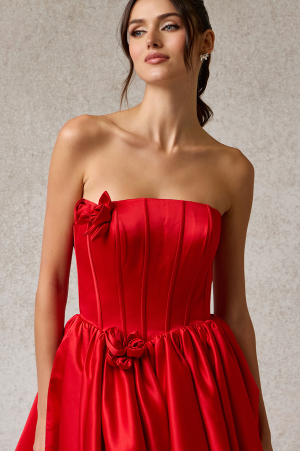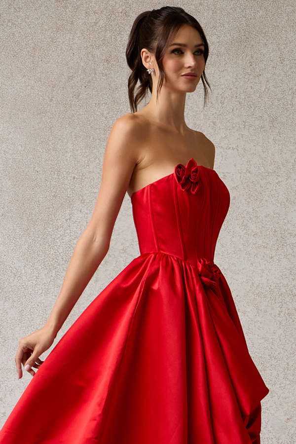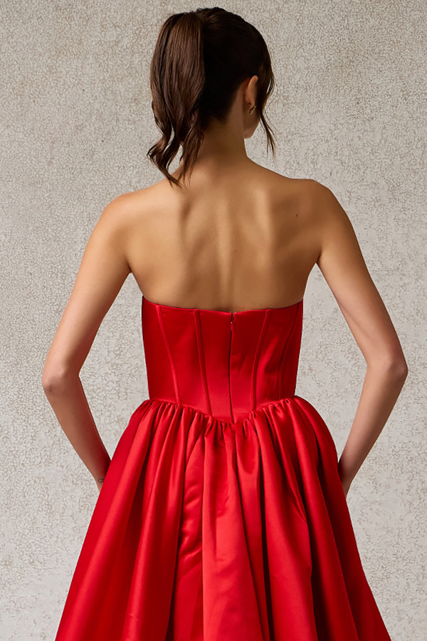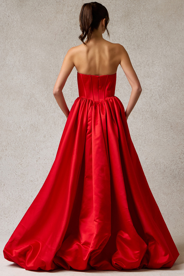 Strapless Straight Neckline Long Bubble Hem Satin A Line Dress.