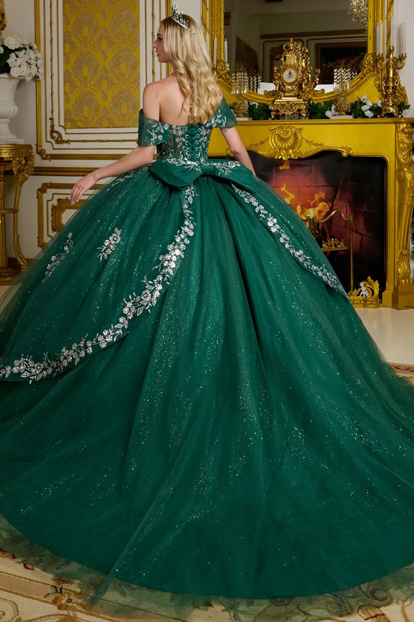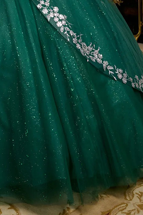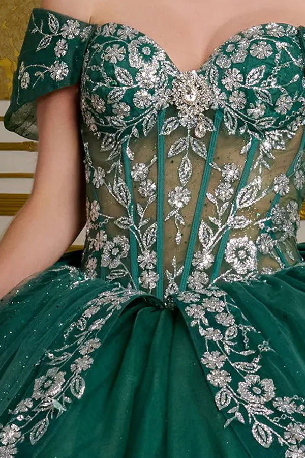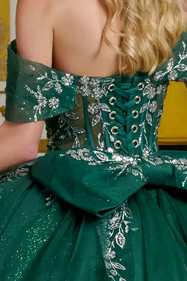 Detachable off-the-shoulder straps adorned with jewels, sequins, and glitter arranged in floral motifs that extend onto the sheer V-neckline corset bodice. Embellishments continue from the bodice, delicately outlining the edges of the overskirt opening. At the back, a detachable bow and bejeweled grommets provide an elegant detail. A glitter underlayer runs throughout the gown, lending a luminous finish to the overall design.