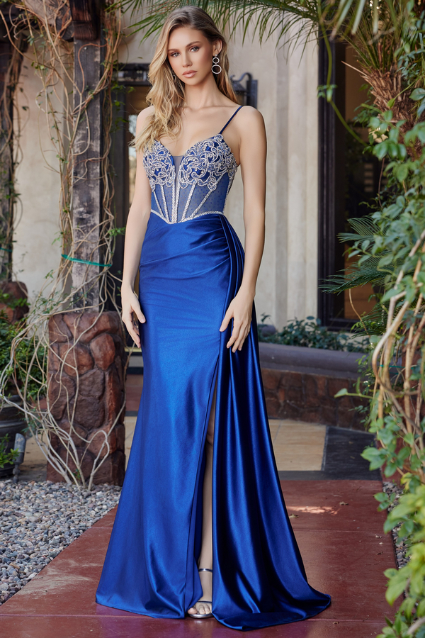 PLUNGING V NECKLINE WITH SPAGHETTI STRAPS AND A SHEER WAISTLINE EMBELLISHED BY SILVER STONES AND BEADWORK ALL AROUND THE BODICE HIGH SLIT AND A SIDE SASH WITH LACE UP BACK.