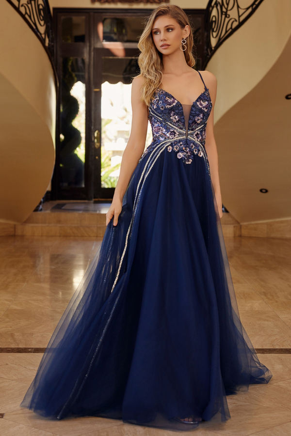 Color: NAVY BLUE Size:- Plunging V Neck Bead/Sequin Design A Line Dress