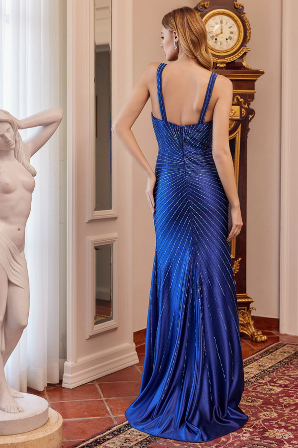 Color: NAVY BLUE Size:- Fitted Long Evening Gown w/ Bead Works
