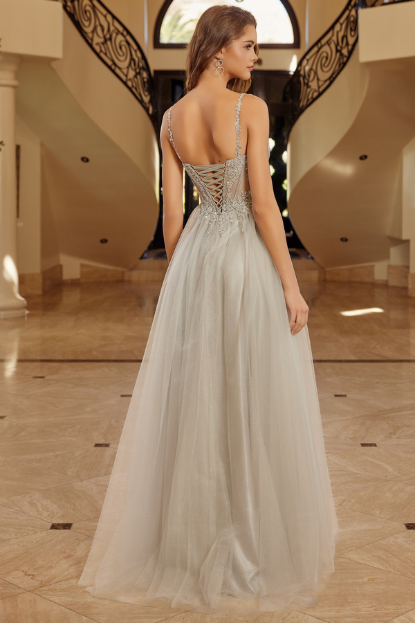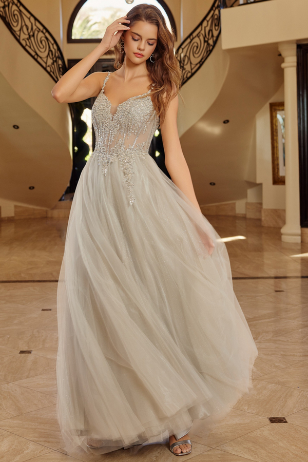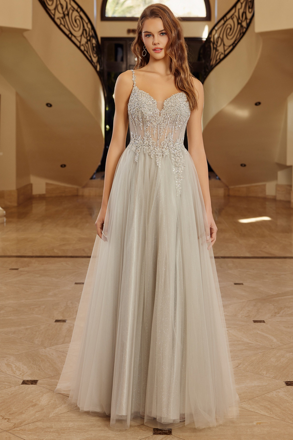 LONG TULLE GOWN WITH PLUNGING V NECKLINE SPAGHETTI STRAPS SHEER WAISTLINE WITH SEQUINED AND BEADED APPLIQUE BODICE AND A LACE UP BACK AND SWEEPING TRAIN.