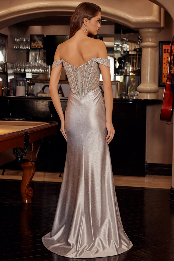 LONG PROM DRESS CRAFTED WITH LUXURIOUS GLITTER STRETCH SATIN FEATURING A PLUNGING V NECKLINE WITH FULL BEADING APPLIQUE BODICE AND A SHEER WAISTLINE WITH OFF SHOULDER STRAPS AND THIGH-HIGH WRAP SLIT AND SWEEPING TRAIIN.