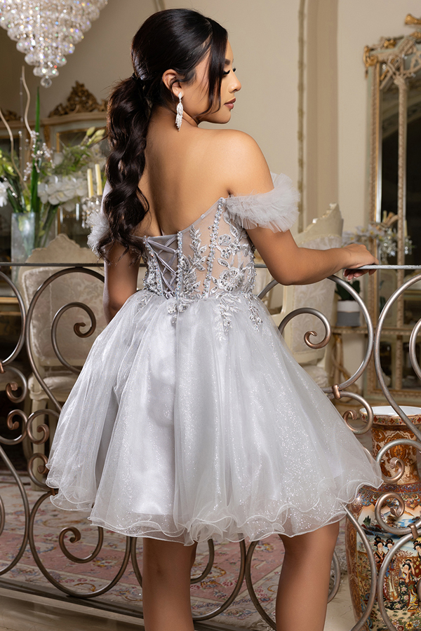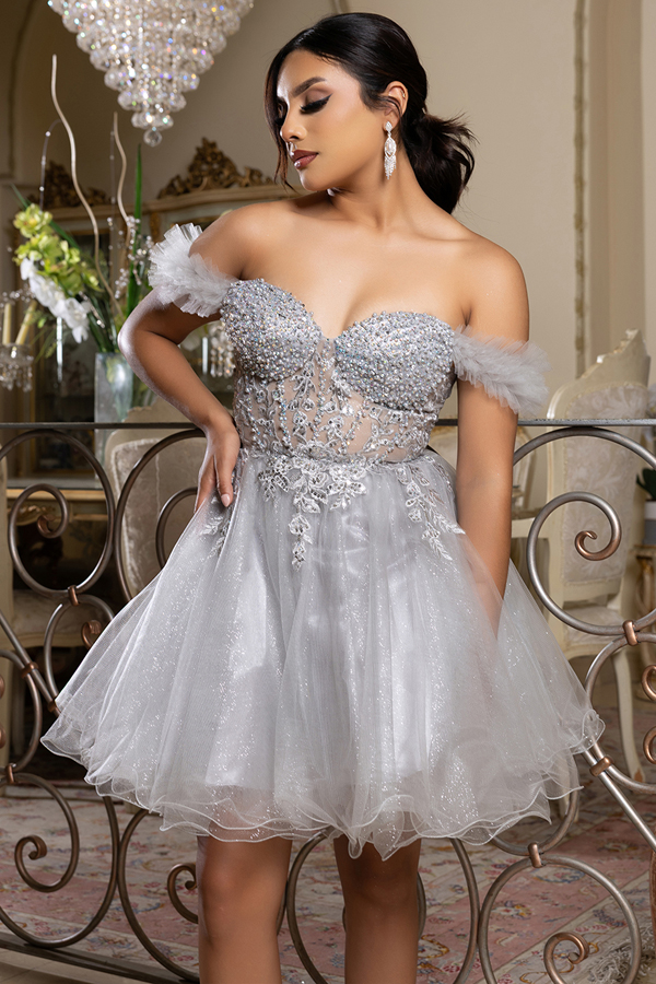Color: SILVER Size:- Off Shoulder Ruffle Sleeve Sweet Top Short Dress