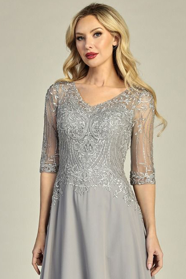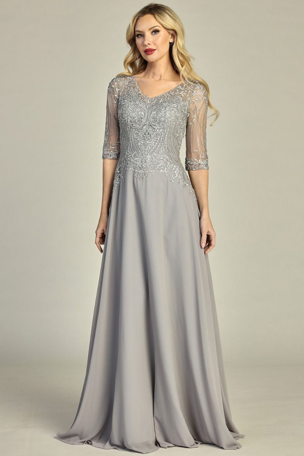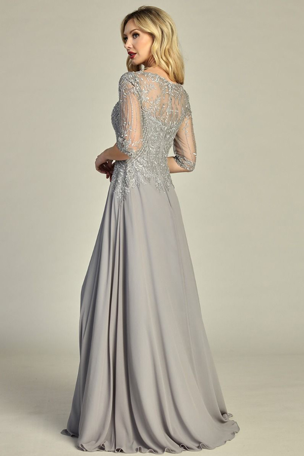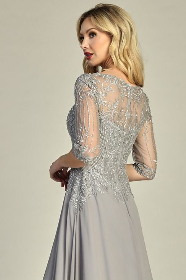 - Sheer 3/4 Sleeve Embellished Chiffon A Line MoB Gown
