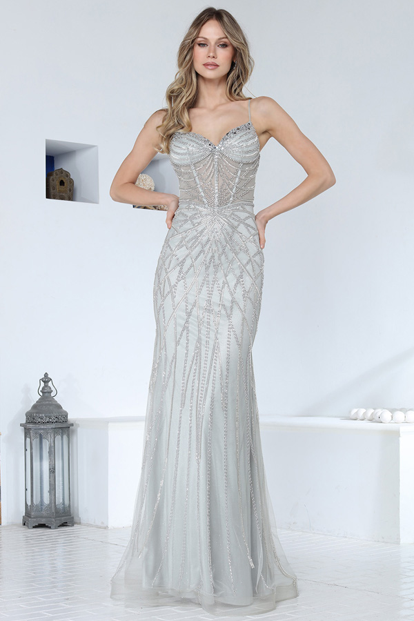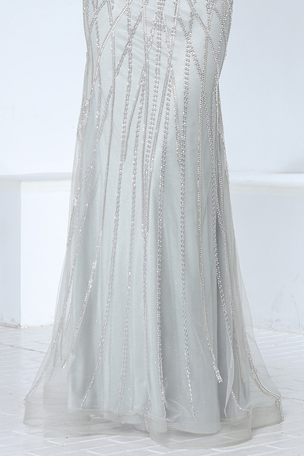 Color: SILVER Size:- Geometric Beaded Mesh Corset Gown