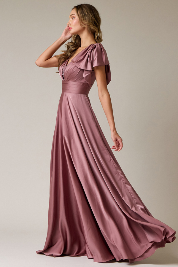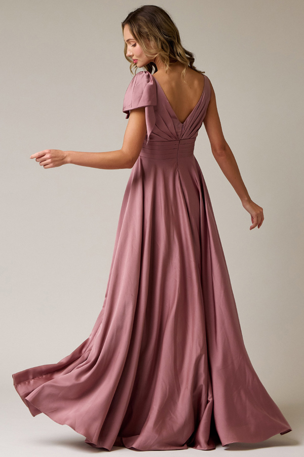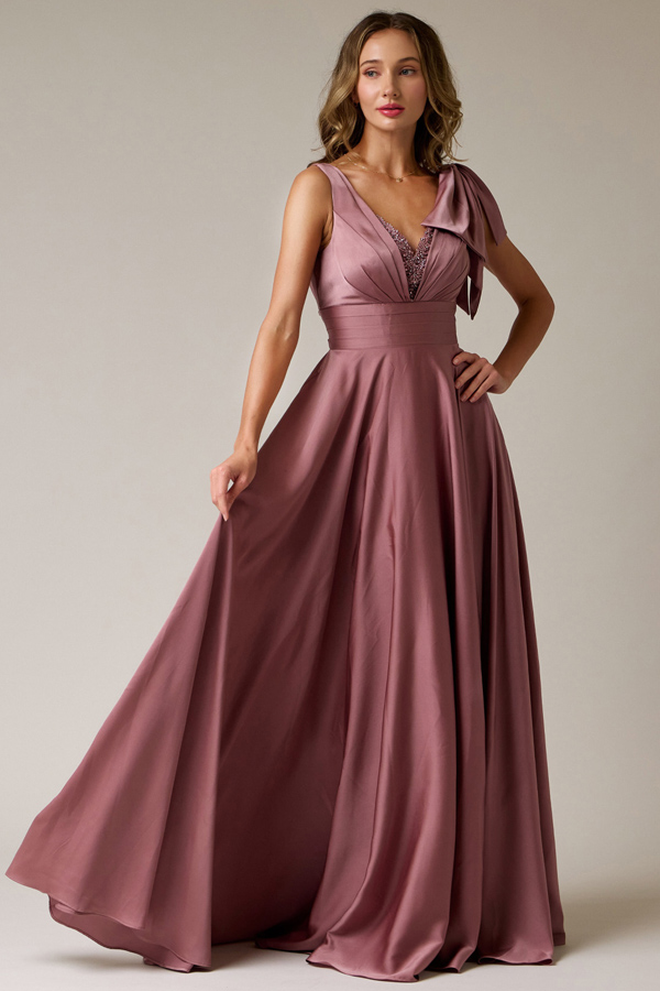 Color: MAUVE Size:Sleeveless Plunging V Neck Stretch Satin A Line Dress.