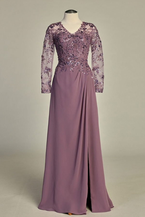 Color: MAUVE Size:- Sheer Long Sleeve Scoop Neck A Line Chiffon MoB Gown