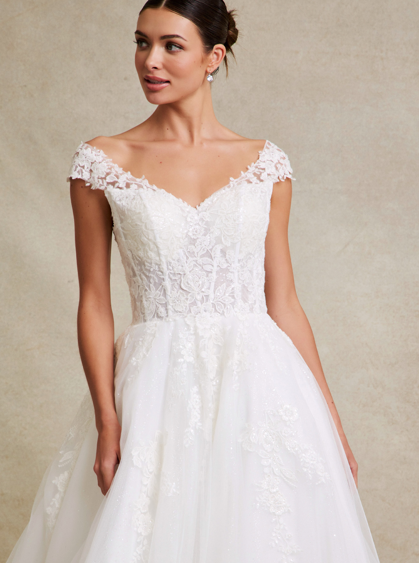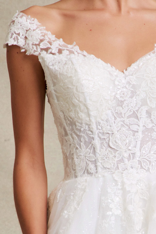 - Portrait Neckline Lace Top A Line Chapel Wedding Gown