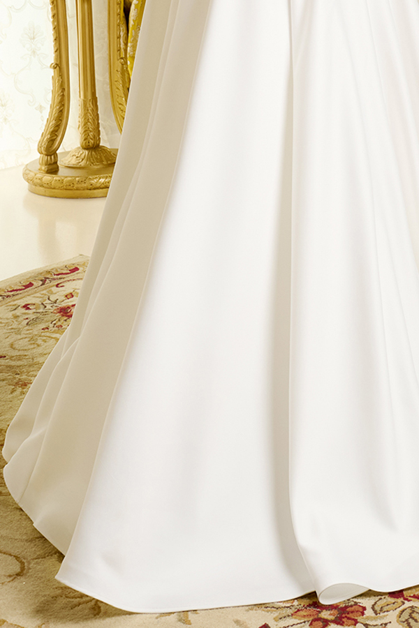 Satin wedding gown embraces a minimalist aesthetic. Pleated off-the-shoulder sleeves are accented with beading along their lower edges, adding a hint of sparkle. The bodice presents a striking contrast — one side is richly adorned with beads and sequins, while the other features sleek pleating that crosses over the embellishments for a sculpted, modern finish.