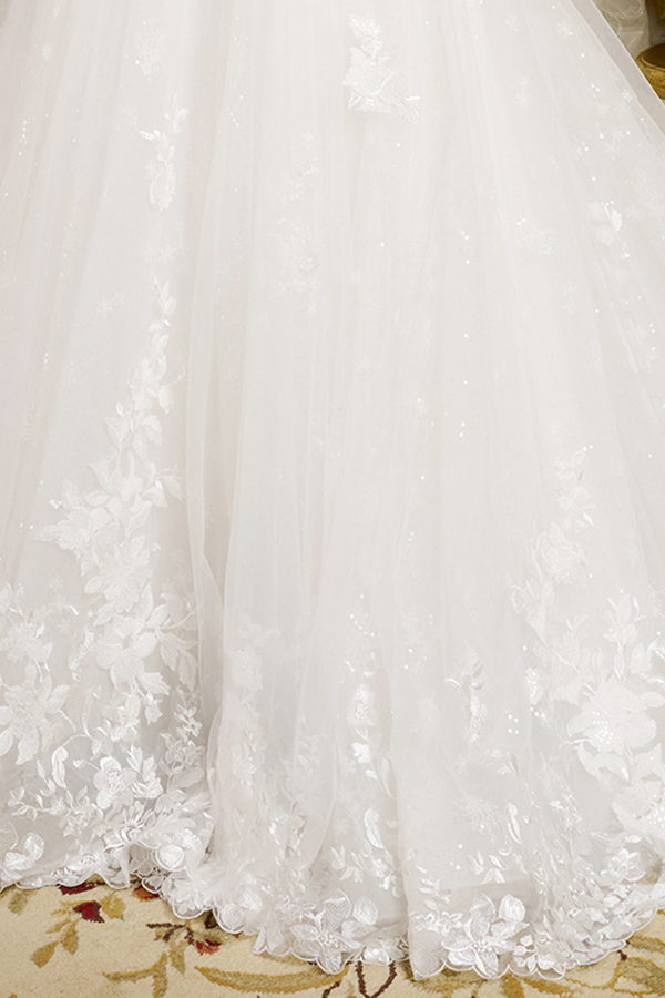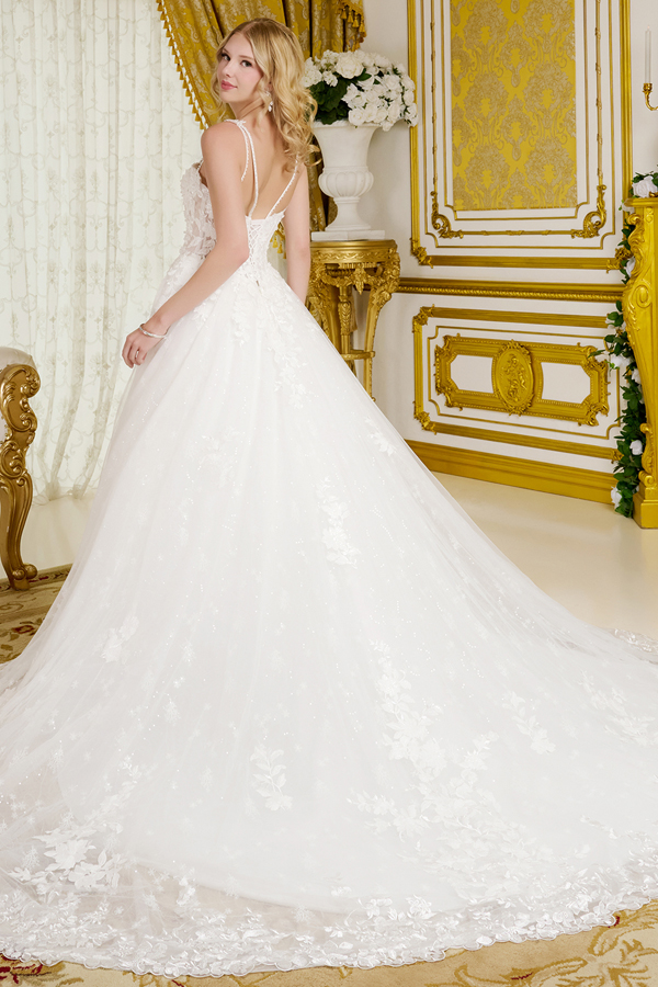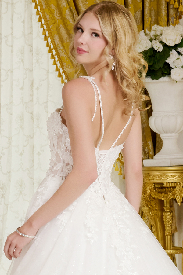 Two beaded spaghetti straps delicately connect to the sweetheart neckline bodice on this A-line wedding gown. The dress is beautifully adorned with beads, embroidery, and sequins. The full skirt features a scalloped hem formed by detailed embroidery, with embellishments concentrated along the edges for a graceful finish. A sequined embroidered underlayer subtly shines through, adding depth and elegance as the skirt extends into a soft, sweeping train.