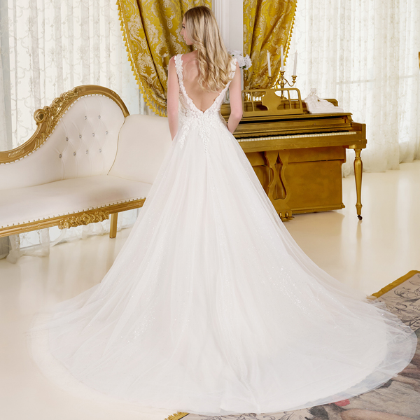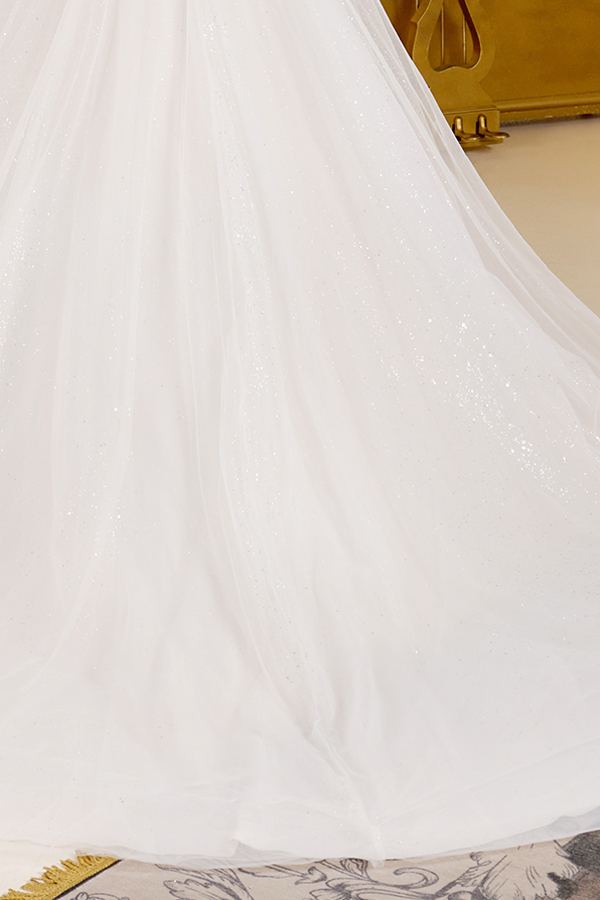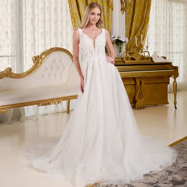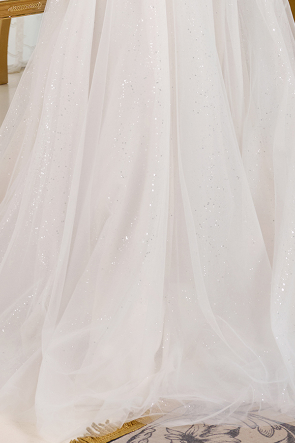 A-line wedding dress features a fitted bodice with straps adorned in beads, embroidery, and glitter. The V-neckline bodice has a low V-back, finished with a discreet zipper closure. The skirt has a clean, minimalist design, enhanced by a sparkly glitter underlayer that is seen throughout the entire gown.