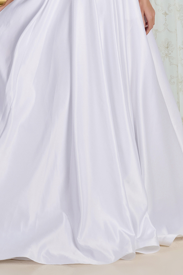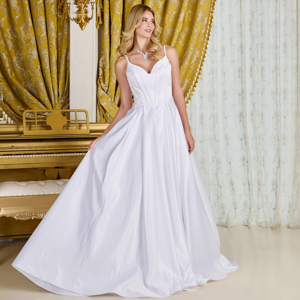Minimalist A-line, satin wedding gown. Delicate spaghetti straps frame a flattering V-neckline, leading into a structured corset bodice with pleated detailing and a corset overlay for added dimension. The Basque waistline enhances the silhouette, flowing into a full A-line skirt with soft box pleats and a train. Perfect for the bride seeking a timeless silhouette with a clean, refined finish.