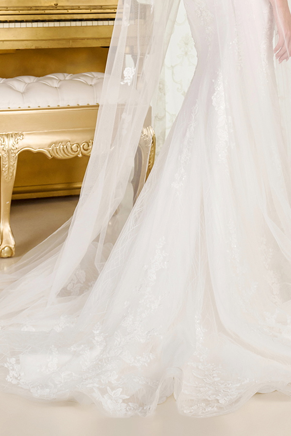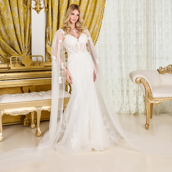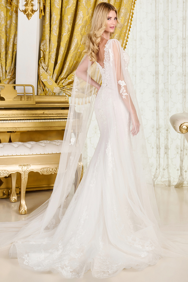 - Mesh Cape Sleeve V Neck Trumpet Wedding Gown