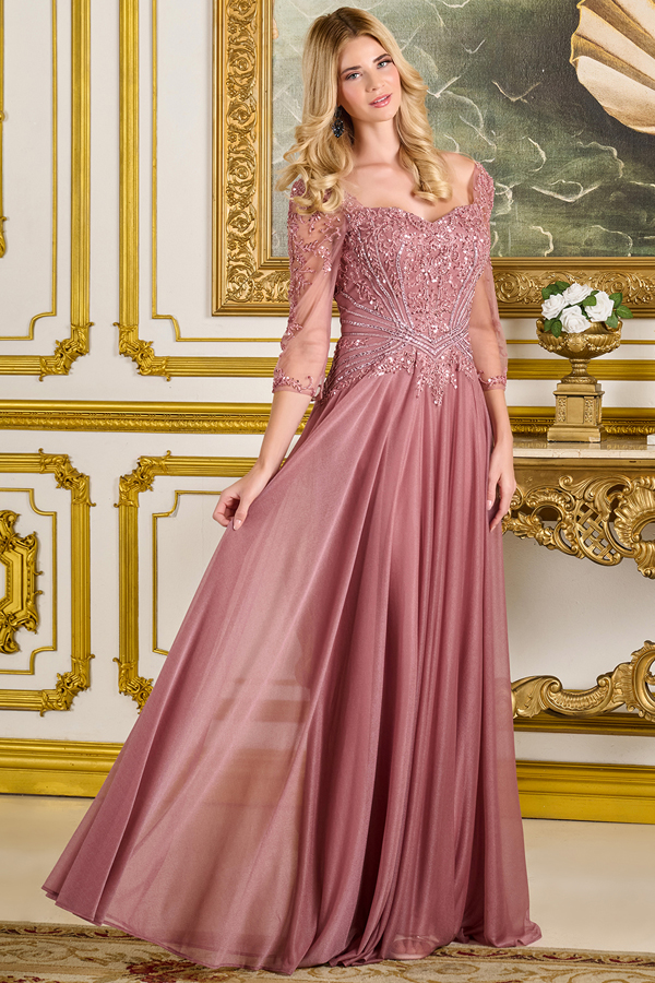 Beautifully crafted for the modern mother of the bride or groom, this gown exudes understated luxury and timeless charm. The bodice showcases exquisite embroidery accented with beads, jewels, and sequins, complemented by sheer 3/4 sleeves and a timeless sweetheart neckline. The flowing A-line skirt is crafted from shimmering metallic jersey, creating a soft, radiant glow with every movement.