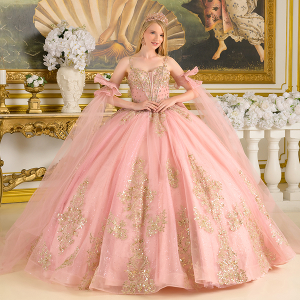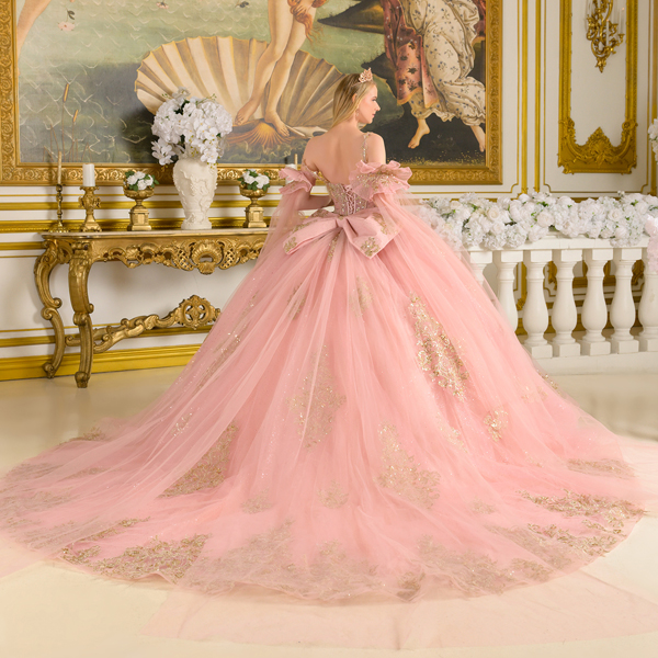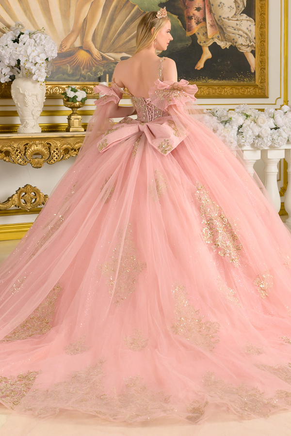 Quinceanera ball gown, featuring delicate thin straps and a V-neckline corset bodice. The bodice is enhanced with ruched tulle and scattered jewel accents, adding soft texture and sparkle. Embellished with intricate embroidery, sequins, and shimmering jewels, this gown dazzles from every angle. Tulle over a glitter mesh enhances the luminous effect. Includes detachable decorative cuff sleeves with an attached train, and a detachable back bow.