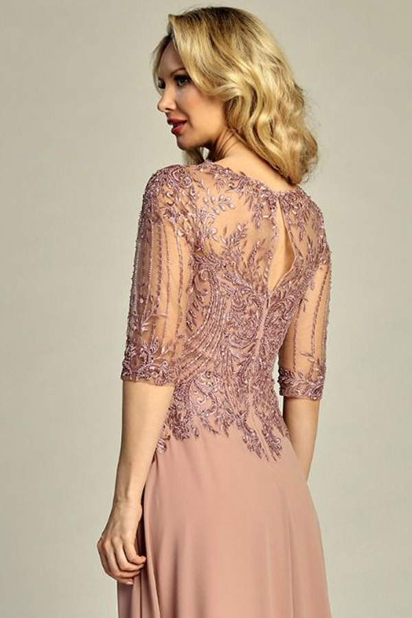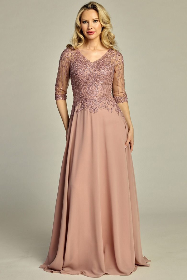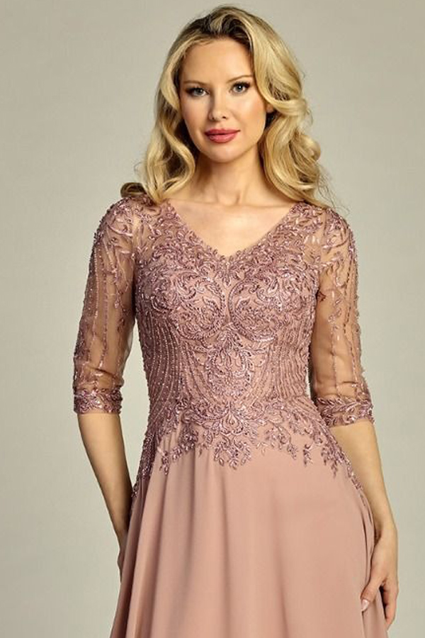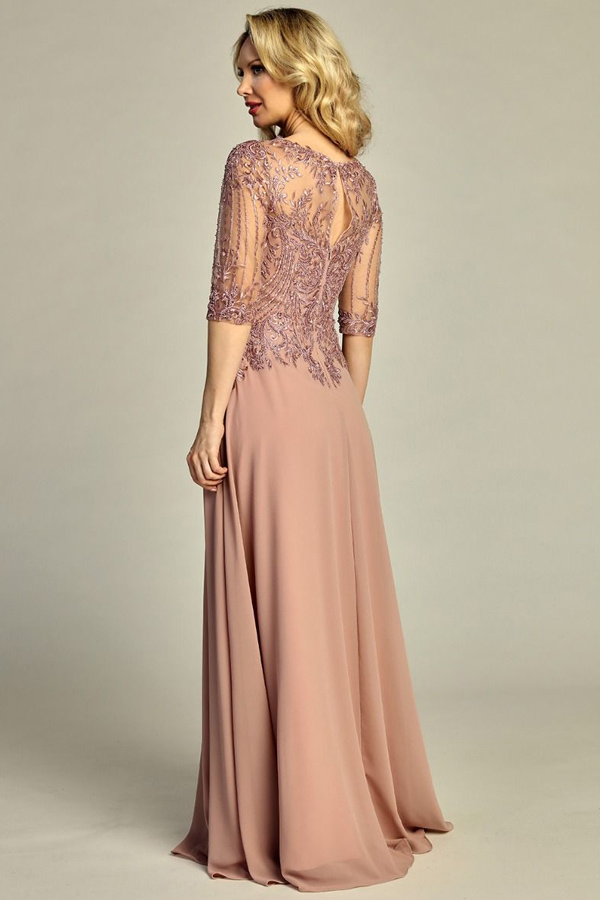 Color: DUSTY ROSE Size:- Sheer 3/4 Sleeve Embellished Chiffon A Line MoB Gown