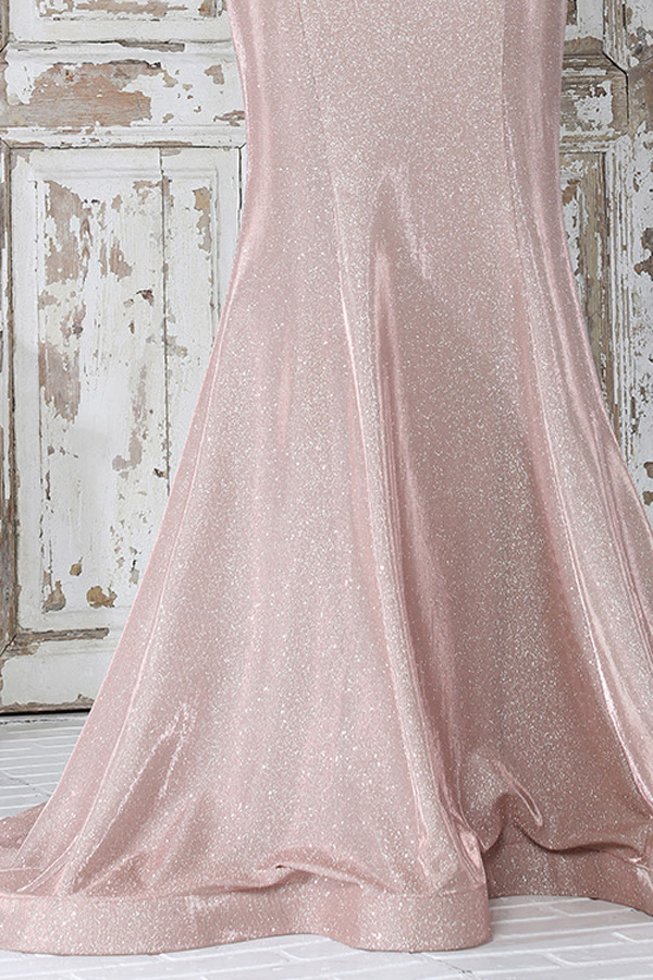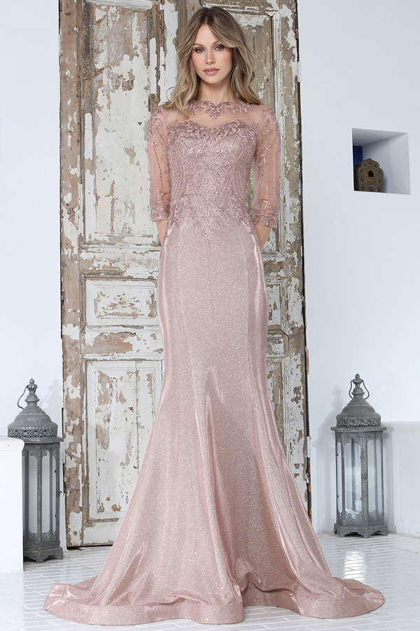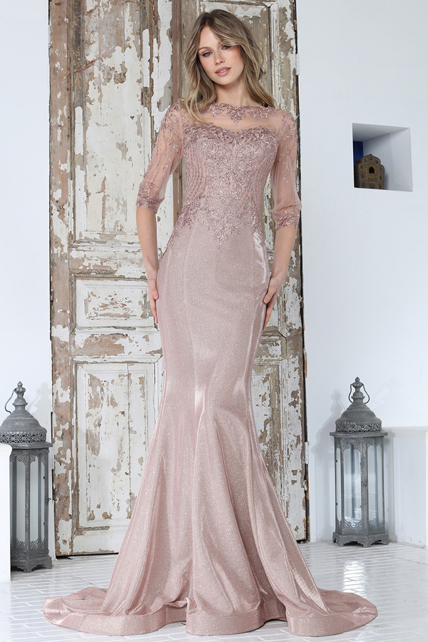 Color: DUSTY ROSE Size:- 3/4 Sleeve Embroidered Mesh Metallic Mermaid Gown